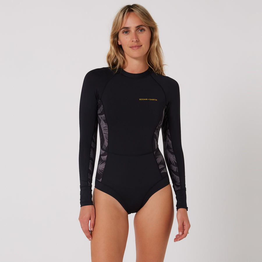 For that extra sun protection the Ladies Oceana Long Sleeve Back Zip Surf Suit has you covered. Made from high quality RECYCLED Polyester / Elastane with flat locked seams for maximum durability, stretch and comfort. Features a water resistant full length zipper and contour panelling for greater comfort. UPF 50+ UV Protection. This rash vest will protect you in style on those harsh summer days. Designed for surfing.