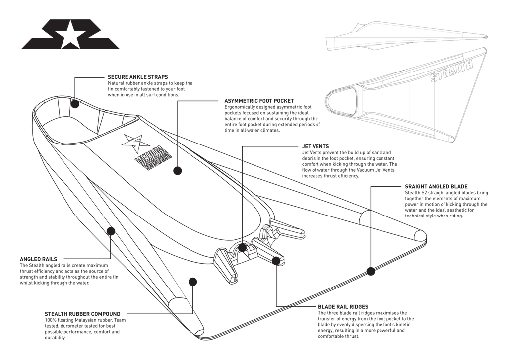 We are pretty happy with the S2 shape and the power provided, so wanted to create a fin that was easy on the feet. To achieve this, we've used a super soft *durometer rubber in the Foot Pocket, while retaining stiffness through the blade to make this one of the comfiest fins you will ever wear.